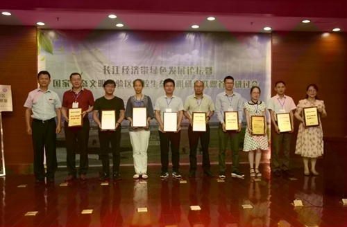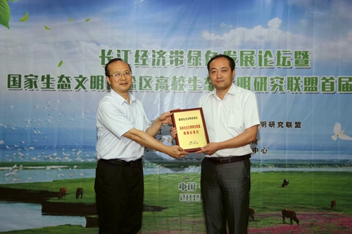6月15日上午,在长江经济带绿色发展论坛暨国家生态文明试验区高校生态文明研究联盟首届研讨会上,江西省人大原副主任、省人民政府原副省长、江西生态文明研究促进会理事长胡振鹏教授,江西省生态文明办专职副主任刘兵,九江市副市长李军,九江学院党委书记、江西长江经济带研究院院长赵伟等共同为国家生态文明试验区高校生态文明研究联盟揭牌。江西省生态文明办专职副主任刘兵为联盟理事长单位永利yl23411集团官网江西长江经济带研究院授牌。九江学院校长刘晓东教授为作为联盟副理事长单位的海南大学、江西理工大学、井冈山大学、贵州师范学院、黔南民族师范学院、铜仁学院、福建工程学院、泉州师范学院和闽江学院等高校相关学院或研究机构授牌。