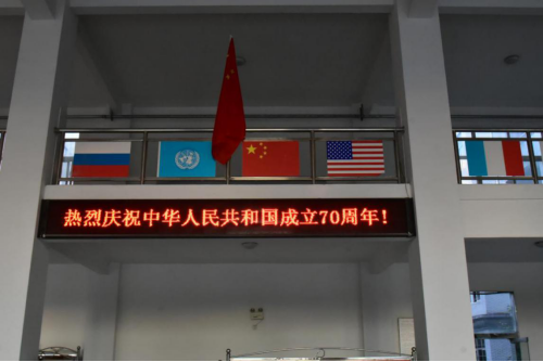 校园内,一面面鲜艳的五星红旗在迎风飘扬,“热烈庆祝中华人民共和国成立70周年”等横幅标语醒目悬挂,各种各样鲜艳的“中国红”元素将校园装扮一新,充分展现新时代九院人昂扬奋进的精神风貌,表达了对新中国成立70周年的美好祝愿。走进学校义丰楼一楼大厅,大厅的LED大屏上,一段内容为“七十年辉煌今朝铸就,祝福祖国母亲永远昌盛繁荣!”“七十周年建设历程硕果累累,新世纪创业道路前程似锦!”的标语分外瞩目,吸引不少师生驻足。“热烈庆祝中华人民共和国成立70周年!”“盛世华诞70周年”等庆祝新中国成立70周年的标语在各个学院的大屏上被点亮。