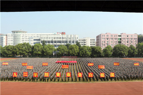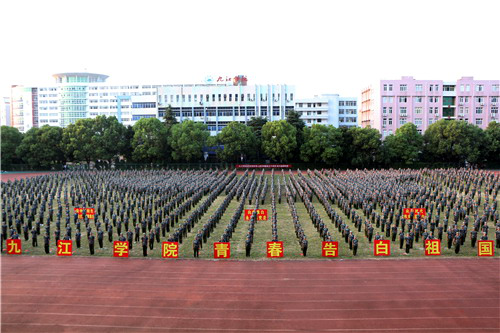 田径场正中央,一面巨幅国旗徐徐展开,同学们高举“向党表白,永远跟党走”“向中国特色社会主义诚挚表白”“向新时代伟大祖国表白”标牌,高声齐呼“我们在九江学院,以青春的名义,向党表白,永远跟党走;向中国特色社会主义诚挚表白,坚定“四个自信”;向新时代伟大祖国表白,青春心向党,建功新时代。爱国、奋斗、奉献,我为祖国骄傲!我为祖国骄傲!我为祖国骄傲!”他们军姿挺拔,动作整齐,喊声铿锵有力,气势磅礴。
