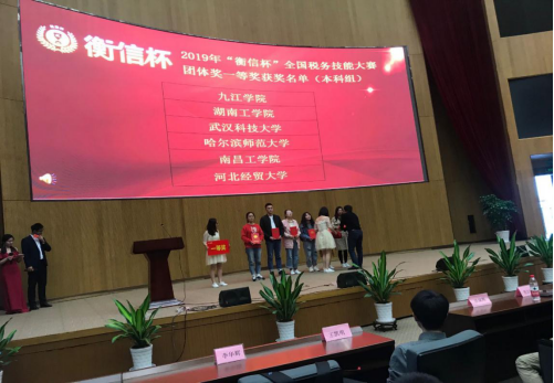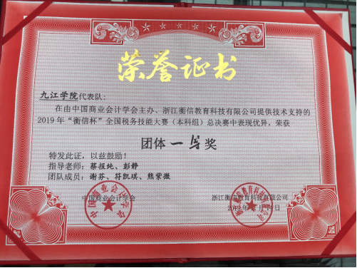 2019年“衡信杯”全国税务技能大赛总决赛于11月13—14日在浙江杭州成功举办。在指导老师会计学院副院长蔡报纯、彭静老师带领下,由会计A1715班谢芬、会计A1717卓越班符凯琪、熊紫薇3名同学组成的九江学院代表队不负重望,最终以394.521总成绩获得本科组团体总分第二名,荣获本次大赛团体一等奖。同时,熊紫薇同学获得税务公务员岗位个人二等奖、符凯琪获得税务主管岗位个人三等奖、谢芬获得办税员岗位个人三等奖,另外3位同学还分别获得了“衡信教育有限公司”的两年免试入职资格。为学校和学院争得了荣誉。