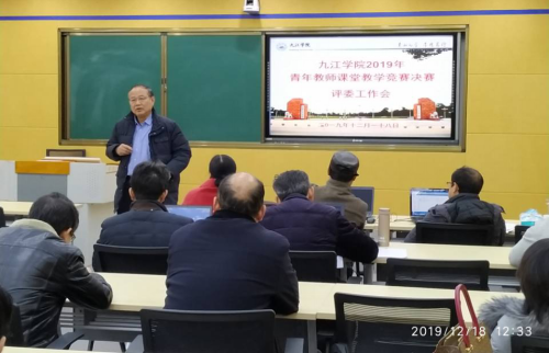 12月18日、21日, 九江学院2019年青年教师课堂教学竞赛(决赛)在香远楼417和文理实验楼409两个录播教室顺利举行。决赛由教务处主办,共有44位从二级学院初赛中脱颖而出的青年教师参加了决赛。决赛分文科组、理科组、工科组、思政组四个组进行,竞赛形式与江西省高校青年教师教学竞赛一致,竞赛内容由教学设计、课堂教学和教学反思三部分组成,成绩评定采用百分制,三者权重分别为15%、80%、5%。