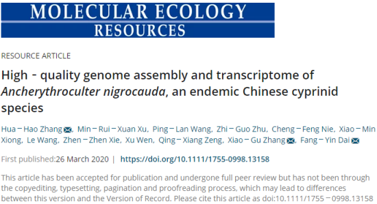 近日,永利yl23411集团官网药学与生命科学学院教师张化浩博士的研究团队与西南大学和赣州市水产研究所合作的研究成果以题为《High-quality genome assembly and transcriptome ofAncherythroculter nigrocauda, an endemic Chinese cyprinid species》发表在《Molecular Ecology Resources》上。《Molecular Ecology Resources》是生物进化领域权威期刊,其最新影响因子7.049,为一区Top期刊。这是继张化浩博士团队近日在《Nature Communications》发表成果后的又一重要研究进展。