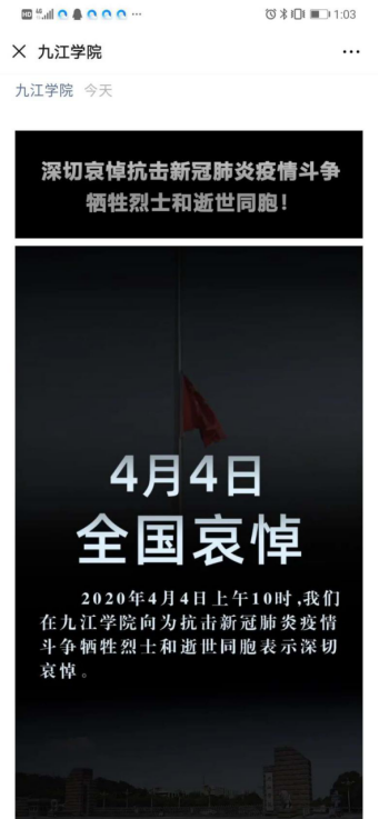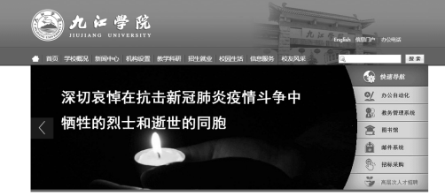 为表达对抗击新冠肺炎疫情斗争牺牲烈士和逝世同胞的深切哀悼,4月4日,九江学院主校区、九江学院浔东校区下半旗志哀。校园网、九院新媒体都在首页首屏使用黑白页面,以此致敬英雄,缅怀同胞!