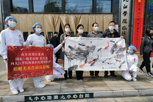 山东烟台莱州国家一级美术大师史庆尧先生为九江学院附属医院援鄂医护工作者们白衣执甲、救死扶伤的精神所感动,在疫情期间特别创作50幅美术作品赠送医院,表达一名文艺工作者的敬意,并随画发来慰问信:“九江学院附属医院的援鄂医护工作者们,你们用行动践行了新时代医者风范,毫不畏惧地冲在第一线,团结一致抗击疫情,为人民的健康保驾护航,充分展现了‘敬佑生命、救死扶伤、甘于奉献、大爱无疆’的职业精神,在此我向你们表达最崇高的敬意和最真挚的问候,您们辛苦了!”