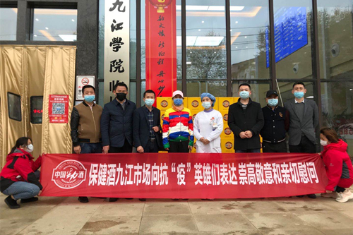 “枝叶相连,血脉相亲。感谢九江学院附属医院援鄂医护人员在生死考验的危急时刻,用医者仁心呵护生命,用无私奉献守护了人民的安康,他们是疫情防控最有担当的勇士,是这个时代最可爱的人。” 作为湖北本土企业的劲牌有限公司感恩九江援湖北医护人员在疫情期间的英勇付出,通过中国红十字会向九江学院附属医院援助湖北医护英雄赠送92箱金标劲酒,在队员即将结束休整归家之际,第一时间为他们赠送爱心物资,对他们表达更多关怀和敬意,用“爱心”迎接英雄回家。