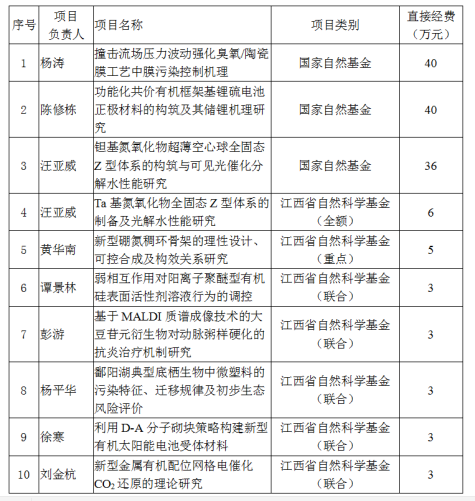 近日,国家自然科学基金委公布了2020年度国家自然科学基金申请项目评审结果,永利yl23411集团官网化学化工学院获批国家自然科学基金项目3项,获批直接经费共计116万元。此前,江西省科技厅、江西省自然科学基金委公布了2020年度江西省自然科学基金项目立项结果,化学化工学院获批江西省自然科学基金项目7项,其中重点资助1项。