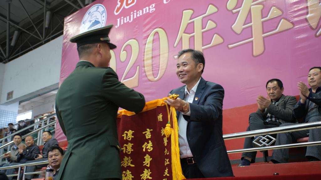 学校领导分别给获奖班级颁发了锦旗;校党委书记赵伟向武警九江支队赠送锦旗。