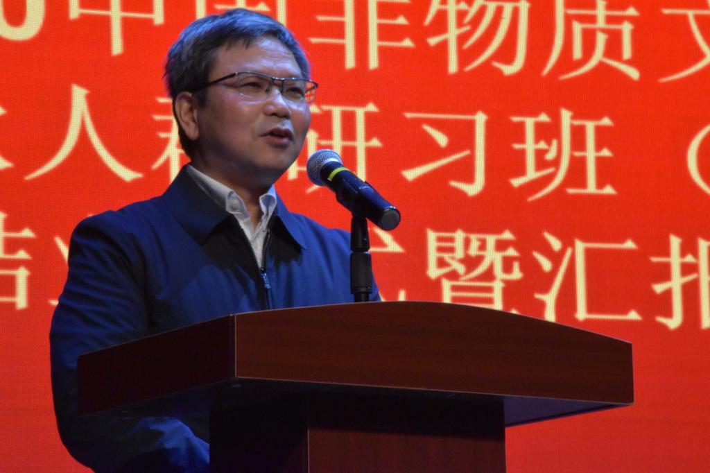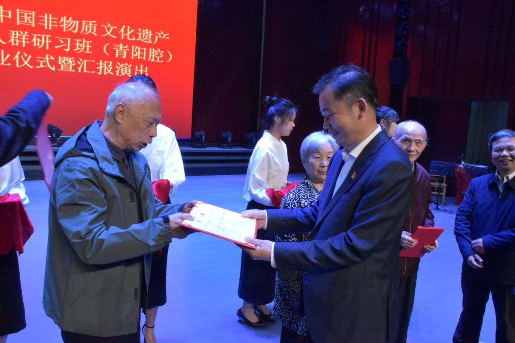 郎道先副厅长作了讲话。他对研培班学员的学习收获表示了肯定。他强调,青阳腔是中国戏曲百花园中一朵娇艳的奇葩,传承了中国传统文化的精髓,是几百年来赣北地区、皖南地区甚至更远的其他地区的人民生产、生活的表现方式。传承并发扬青阳腔艺术,是建设“文化强省”的重要举措。我们有责任传承发扬好它,并将这一艺术推得更广。他指出,保护和发展青阳腔,要坚持守正创新的原则,要扩大传承人队伍,要在表现形式上推动优秀传统文化创造性转化、创新性发展,不断创造新的表演内容。