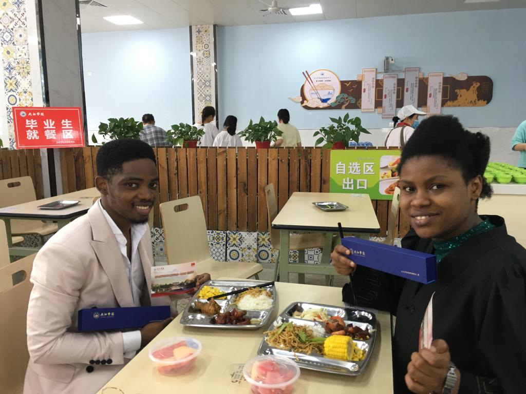 “再刷几次校园卡吧,以后就要用校友卡啦”、“毕业后的生活如果太苦,记得回母校加点糖”、“岁月如歌珍惜师生缘,来日似锦不忘九院情”,学生食堂一条条催泪的横幅,让毕业生们更加眷恋九院食堂的“美食美刻”。中午11点后,毕业生们陆续来到学生一、三食堂和浔东校区食堂。琳琅满目的菜肴已经摆满了餐台,鸿运满途(红烧肉)、青葱岁月(小葱豆腐)、片片情深(九江鱼片)、红红火火(白灼基围虾)等一道道充满寓意的菜肴,让学生们赞美又回味。同学们深情地举起大拇指为有情有味的九院点赞。