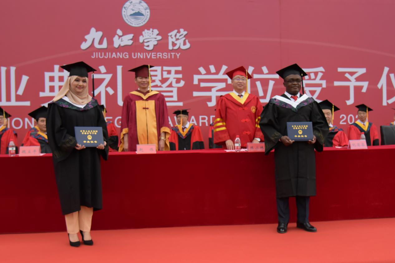 “在学校的学习经历,是我人生宝贵的财富,为我的事业发展打下了良好的基础。我在中国度过了人生最好的年华,回国后,要努力将我们所学的医学知识,帮助那些需要的人,我们还要向亲朋好友介绍中国,向他们讲述我们在中国的故事。”毕业生代表、九江学院2020年度“大学生年度人物”、国际交流学院2015级临床医学专业学生ROMEO以流利的中文对母校多年以来的栽培表达感激。