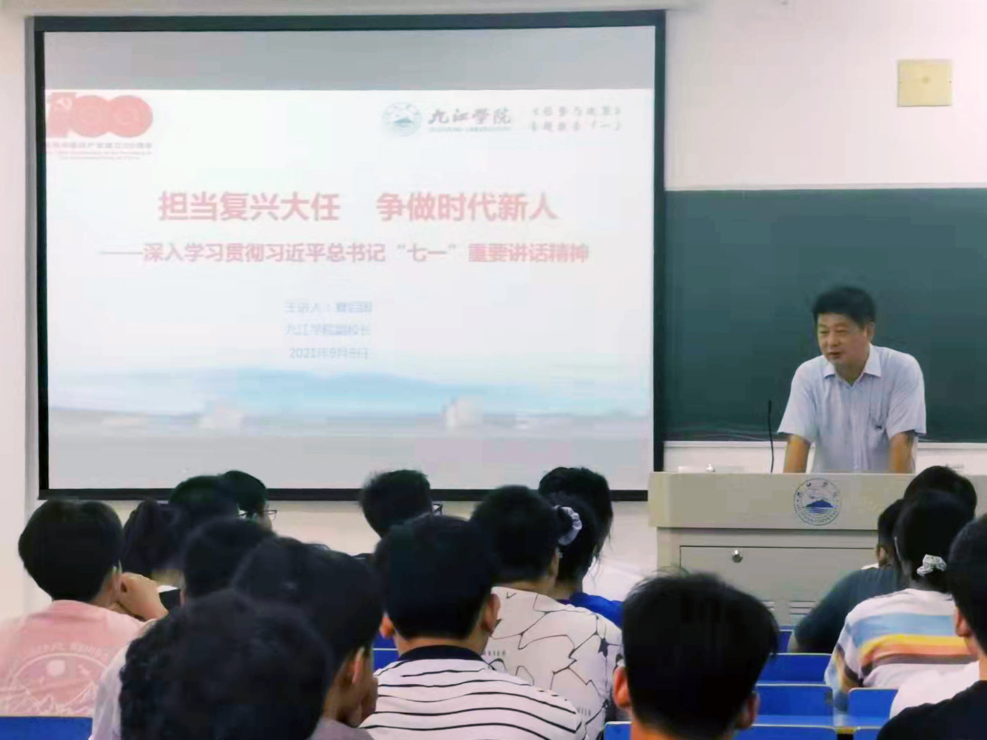 在立信楼304教室,校长陈小林分别为管理学院A2121、A2122班,旅游学院A2021、A2022班和在竞知楼802电子信息工程学院A2111班新生讲授思政第一课。陈小林祝贺同学们进入九江学院,开启了人生新的篇章;希望同学们增强政治意识和爱国情怀,努力学习党史,用习近平新时代中国特色社会主义思想武装头脑;勉励他们尽快适应大学生活,树立远大理想,把个人前途和命运同时代发展、国家前途和社会进步紧密联系在一起。