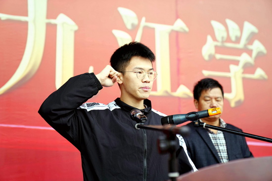 运动员代表胡贻凯向大会进行庄严宣誓:全体运动员将以积极、饱满、热情的态度参加本届运动会,与省运共同成长,弘扬奥林匹克精神,胜不骄,败不馁。友谊第一、比赛第二、赛出风格、赛出水平。