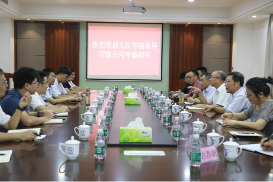在江西晨光新材料股份有限公司,调研组参观了该公司展厅,听取了该公司发展情况介绍,并就搭建产学研创新平台、深化校企合作进行了探讨。陈小林表示,九江学院将依托学校人才、资源等优势,全力服务企业高质量发展,围绕工业企业技术需求开展科技攻关,实现校企共赢发展。