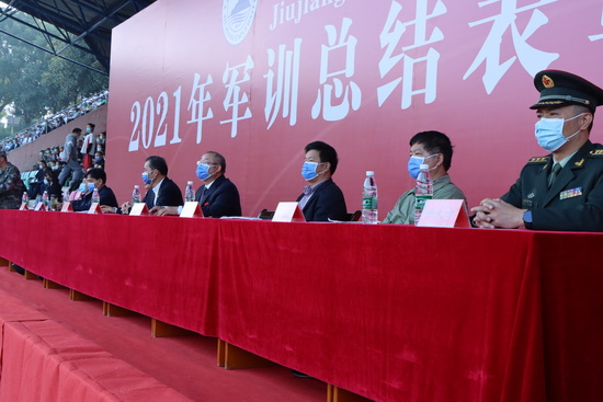 大会宣布了军训会操和内务评比结果,学校领导和九江军分区领导给获奖班级颁发了锦旗。