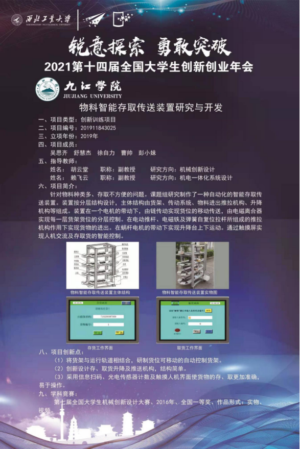 此外,永利yl23411集团官网还在本届大赛中取得了另两项首次突破,机械与智能制造学院由吴思齐、舒慧杰、徐自力、曹帅、彭小妹五名同学负责和胡云堂、赖飞云两位老师指导的《物料智能存取传送装置研究与开发》项目入选第十四届全国大学生创新创业年会改革成果展示项目(全省共9项);创新创业学院负责人宋士华成功入选中国国际“互联网+”大学生创新创业大赛入库评审专家。