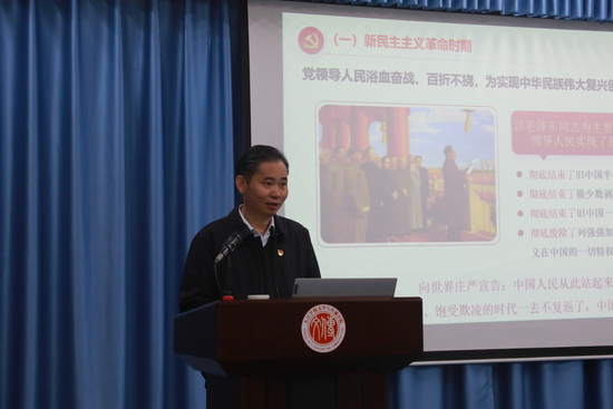 根据省委教育工委安排,12月23日下午,党的十九届六中全会精神全省教育系统宣讲团成员、校党委书记赵伟深入到文传学院作《百年奋进铸辉煌 复兴伟业续华章——深入学习贯彻党的十九届六中全会精神》宣讲报告。党政办和文传学院负责人,学院各党支部书记、学生支部党员和该院网络与新媒体专业学生近60人聆听了报告。