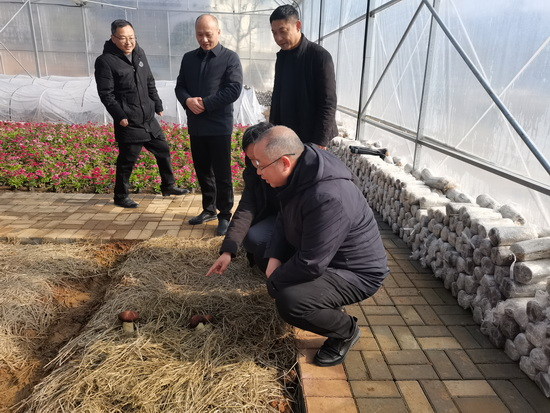 在食用菌栽培大棚,实地考察食用菌栽培种植情况