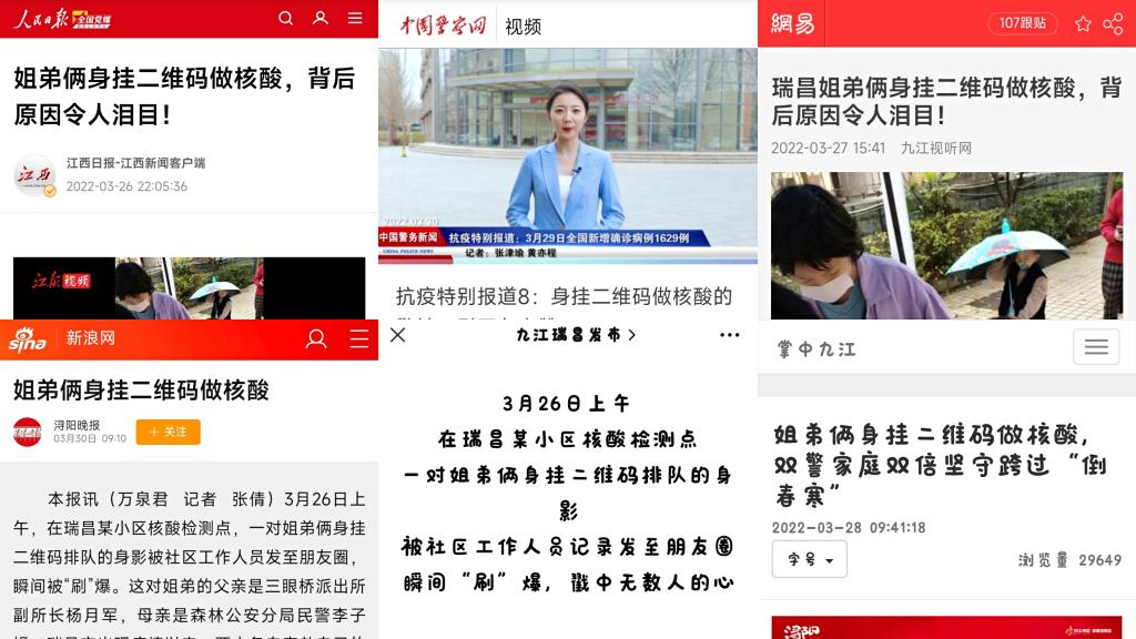 这对姐弟的爸妈都是瑞昌市公安局民警,瑞昌市出现疫情以来,两人各自奔赴自己的岗位,因为夫妻俩都是外地人,长辈均不在身边。家里无人照顾这对姐弟,便出现了开始这一幕。随后,江西日报、网易、九江视听网等媒体报道分别以《姐弟俩身挂二维码做核酸,双警家庭双倍坚守跨过“倒春寒”》《最美战疫人|瑞昌挂二维码做核酸的姐弟俩刷屏了,背后原因让人泪目》等为题,将这段记录进行报道和转载,引网友们纷纷点赞。近日,这对“网红”姐弟的警察爸妈被证实都是九江学院毕业生。
