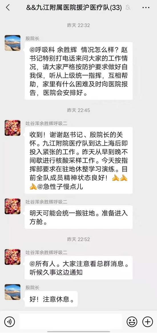 援沪医疗队员们的状态时刻牵动着校院领导的心,5日深夜,在微信群里,附属医院院长殷小平转达了校党委书记赵伟对队员们的关心与慰问,并代表医院党政领导班子关切队员们工作和生活所需,表示如果家里有什么困难务必及时向医院报告,医院一定给予有力帮助。院领导还要求大家严格按防护要求做好自我保护,注意休息,听从上级统一指挥,互相帮助。队员们纷纷表示,“有校院领导的关心和支持,更为振奋,一定不辜负嘱托,在保护好自身安全的同时,高质量完成任务!”