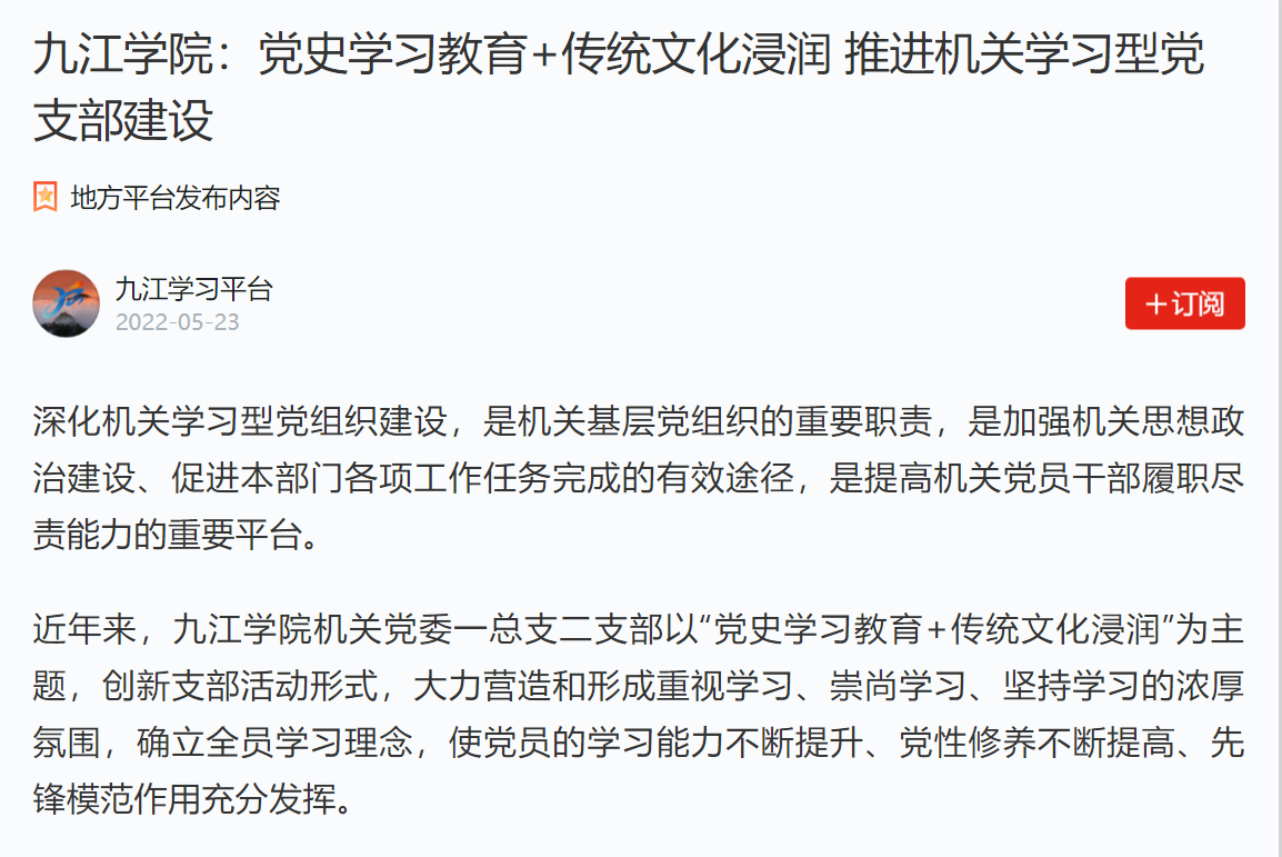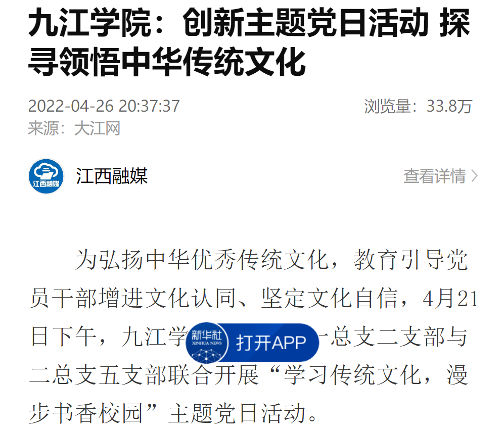 新华社客户端、大江网分别以《九江学院:创新主题党日活动探寻领悟中华传统文化》《九江学院:机关党支部创新主题党日活动·探寻领悟中华传统文化》为题报道,在学习优秀传统文化中汲取智慧和力量,不断增强党性修养,坚守为党育人、为国育才的初心。其中,新华社客户端目前浏览量达33万次数以上。今年5月,学习强国、江西思政以《九江学院:党史学习教育+传统文化浸润 推进机关学习型党支部建设》为题报道了近年来,九江学院机关党委以“党史学习教育+传统文化浸润”为主题,创新支部活动形式,大力营造和形成重视学习、崇尚学习、坚持学习的浓厚氛围的各项活动。
