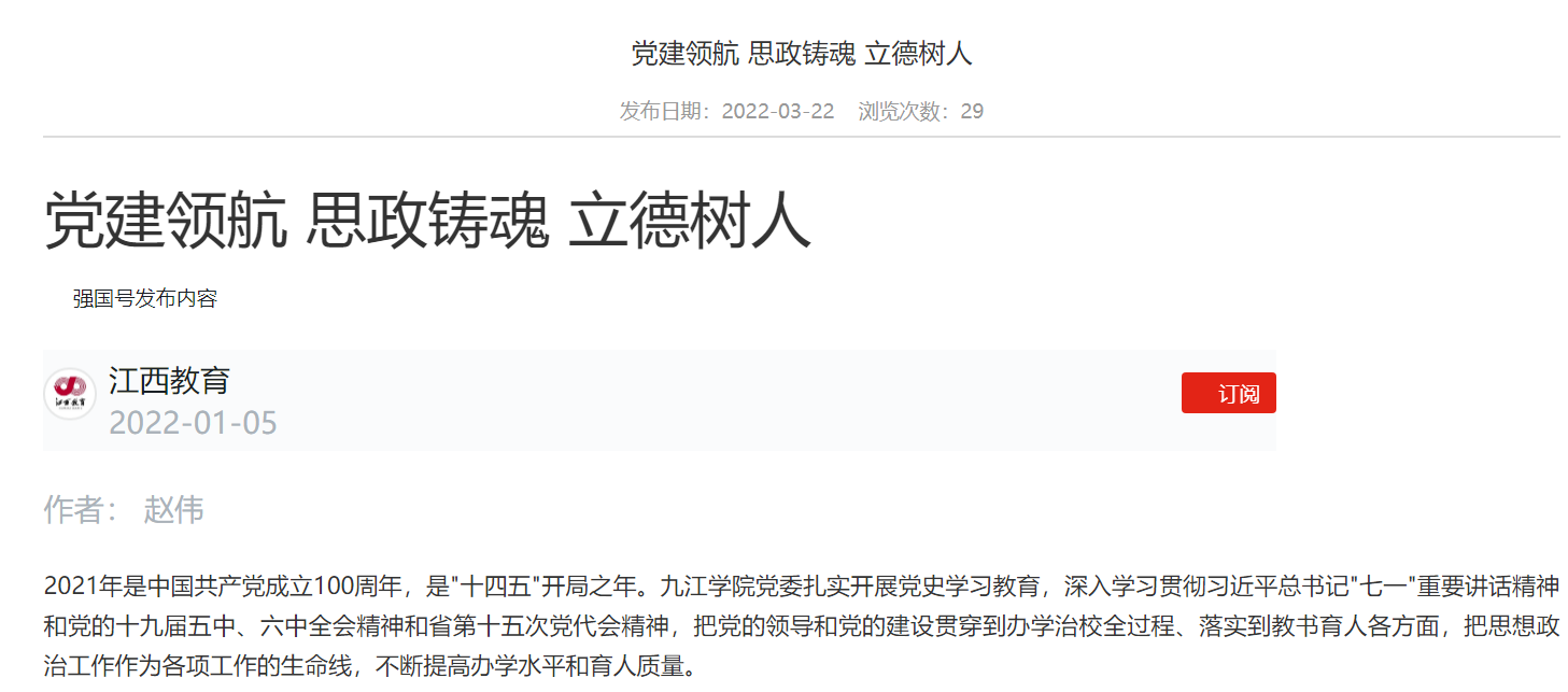 学习强国、江西日报、大江网、江西教育、江西思政等媒体以《党建领航 思政铸魂 立德树人》《九江学院旅游与地理学院着力打造党建品牌提升党建质量》《九江学院:人人争当“红工匠”,“党建+学工”促学生全面成长》《九江学院机械与智能制造学院:构建人人争当红工匠“党建+学工”育人模式,促进学生全面成长》等为题,重点报道了永利yl23411集团官网加强基层党组织建设,抓好学生红色教育、构建人人争当红工匠“党建+学工”培养模式,争创思政工作特色品牌,促进学生全面成长等方面的经验做法。
