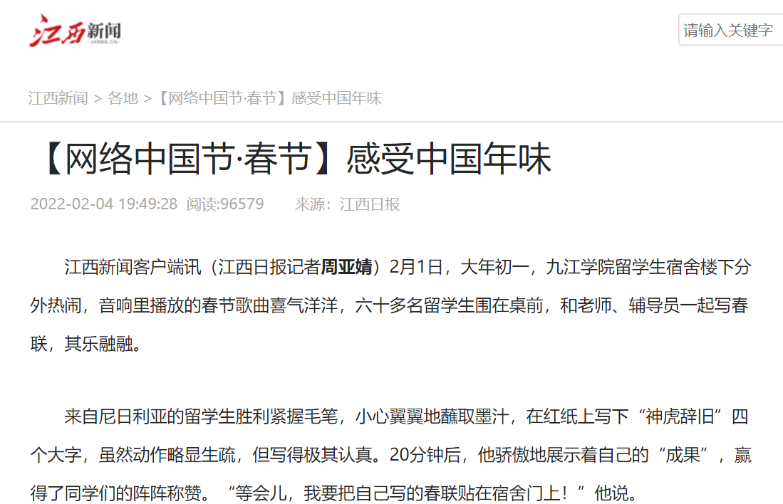 春节期间,江西思政、江西新闻、江西日报分别以《九江学院柬埔寨皇家科学院孔子学院举办系列春节文化交流活动》《网络中国节·春节:感受中国年味》为题,弘扬中华优秀传统文化,浏览量达上万次数。