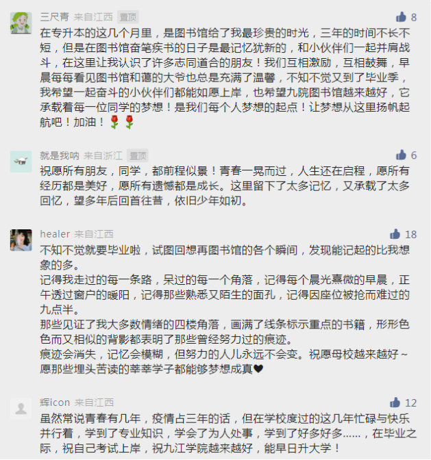 网友水中月在图书馆微信公众号里留言道:“九江学院最美的风景在九院图书馆,这里有最可爱的人,他们每个人都在为未来而努力,难道还有比这更美丽的地方吗?!”