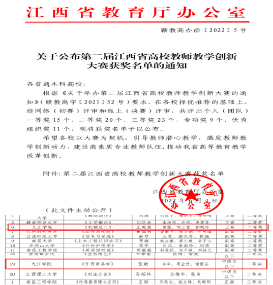 近日,江西省教育厅公布了第二届江西省高校教师教学创新大赛获奖名单,永利yl23411集团官网选派的机械与智能制造学院王英惠教学团队和经济学院张敏教学团队在众多参赛教师团队中脱颖而出,分别荣获正高组和讲师及以下组二等奖。