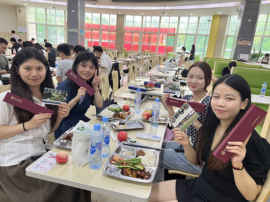 6月28日上午,毕业典礼刚刚结束,同学们就纷纷涌向学生一食堂和三食堂。大家拿着后勤管理处精心设计的精美明信片(餐券)纷纷在签名墙上签上了自己的名字,在通往前程似锦的未来背景墙前烙印住这瞬间的精彩。基围虾、四喜丸子、大鸡腿……饭菜品种丰富、数量多,毕业生们直呼“感动”“吃不完”。“当我拿到学校为我们准备的餐券时,我感到非常意外和惊喜。”文学院的毕业生任偲源称,她吃得非常开心,也感受到了学校的用心。“这是一份很有意义的毕业礼物,我会永远把这顿饭记在心里。”