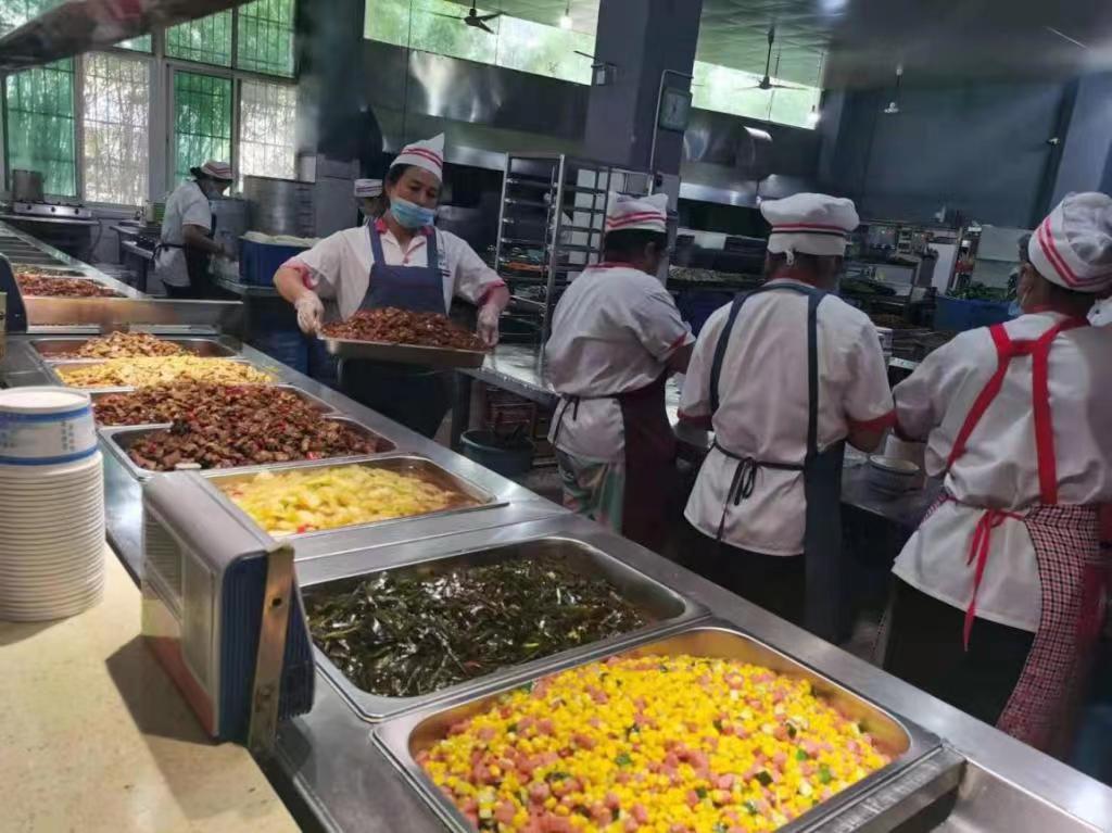 据了解,食堂每三天更新一次菜品,早餐品种丰富多样。为了让师生解渴消暑,食堂还备有足量的绿豆汤和银耳汤。天气炎热,食堂班组员工每天都因衣服湿透更换三次以上工服,却仍然在以饱满、热情的工作在为师生们服务。
