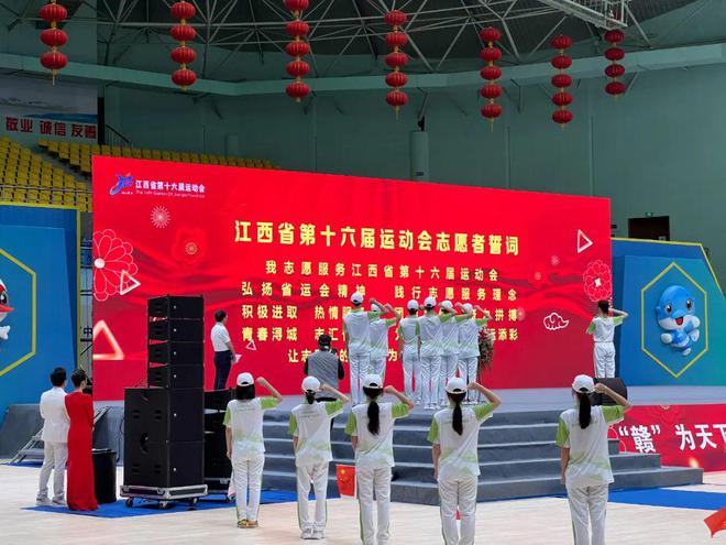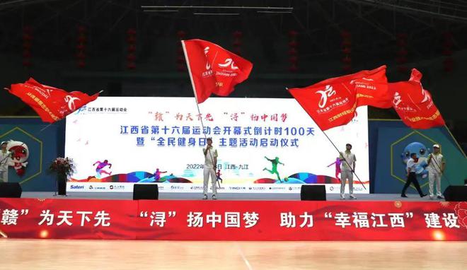 8月8日上午,志愿者们在市体育中心会场参加了江西省第十六届运动会开幕式倒计时100天暨“全民健身日”主题活动启动仪式。仪式上,来自九江学院、九江职业大学、九江职业技术学院、江西财经职业学院的志愿者服务队接受了市委常委,宣传部部长孙金淼授旗。大学生志愿者们高举右手,声音洪亮,发出铿锵有力、斗志昂扬的青春誓言——“我志愿服务江西省第十六届运动会,弘扬省运会精神,践行志愿服务理念,积极进取,热情服务,团结协作,奋力拼搏,青春浔城,志汇省运,为九江争光,为省运添彩,让志愿者的微笑成为九江最好的名片。”