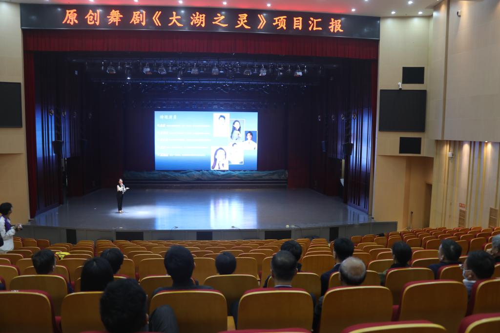 原创舞剧《大湖之灵》项目汇报和(片段)展示在艺术学院音乐厅举行。艺术学院舞蹈教研室主任张栗娜就舞剧创作背景、团队构建、创作进展、预期目标等作了汇报;舞剧总导演花鸣对舞台呈现进行了详细阐述。舞蹈专业学生现场展示了“梦”“水和鸟”“网惘”三个排练片段。