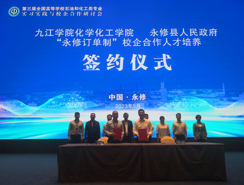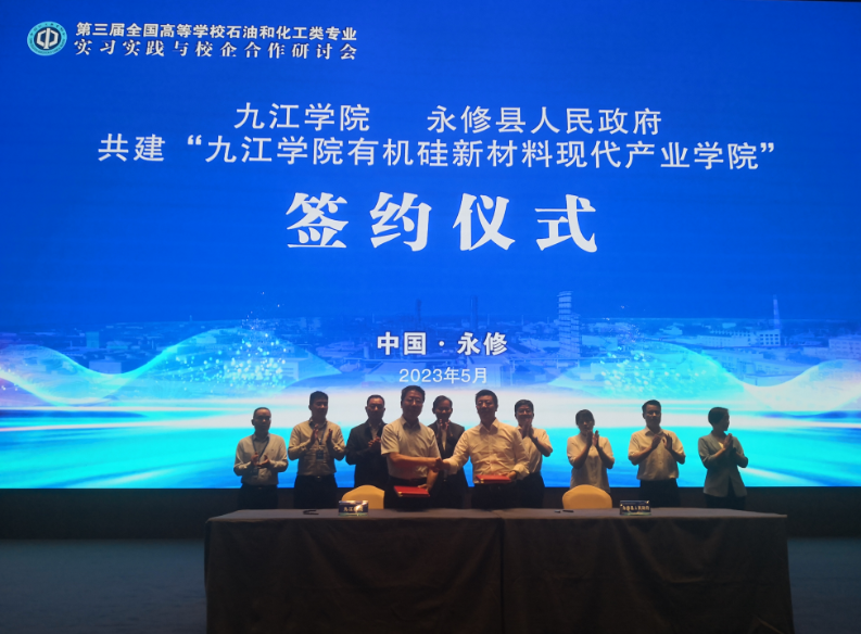 5月13日,在永修县吴城召开的第三届全国高等学校石油和化工类专业实习实践与校企合作研讨会上,九江学院与永修县人民政府签订协议,推动合作共建“有机硅新材料现代产业学院”,开展“订单制”校企合作人才培养。永利yl23411集团官网党委书记赵伟、副校长严平,永修县委书记秦岭、县长朱超等,永利yl23411集团官网党政办、教务处、创新创业学院、化学化工学院负责人与现场300余名参会嘉宾一起共同见证签约仪式。