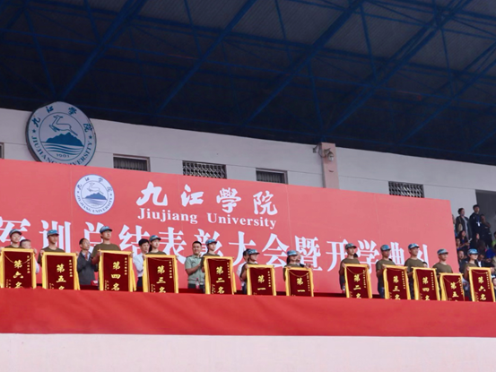 军训旅旅长、武警九江支队机动大队教导员韩凌宣布军训会操结果,军训旅政委、学生处处长吴铃宣布军训内务评比结果。
