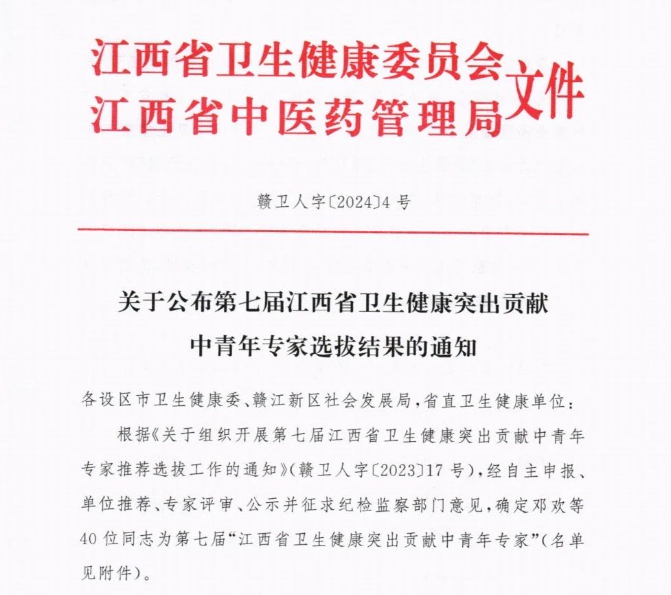 据悉,“江西省卫生健康突出贡献中青年专家”是由省卫健委牵头,经自主申报、单位推荐、专家评审及公示等环节进行评选的省级人才荣誉称号。获评人员是在全省卫生健康系统内从事医疗、预防、疾控、保健、科研及中医药等领域工作中作出贡献,创造出显著社会、经济效益的中青年专业人才。
