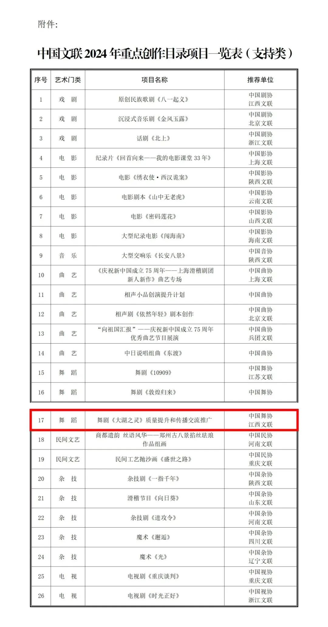 近日,中国文联公布了2024年重点创作目录项目,永利yl23411集团官网艺术学院与江西省文联共同打造的原创舞剧《大湖之灵》,作为江西省唯一和全国入选的三部舞剧作品之一成功入选。