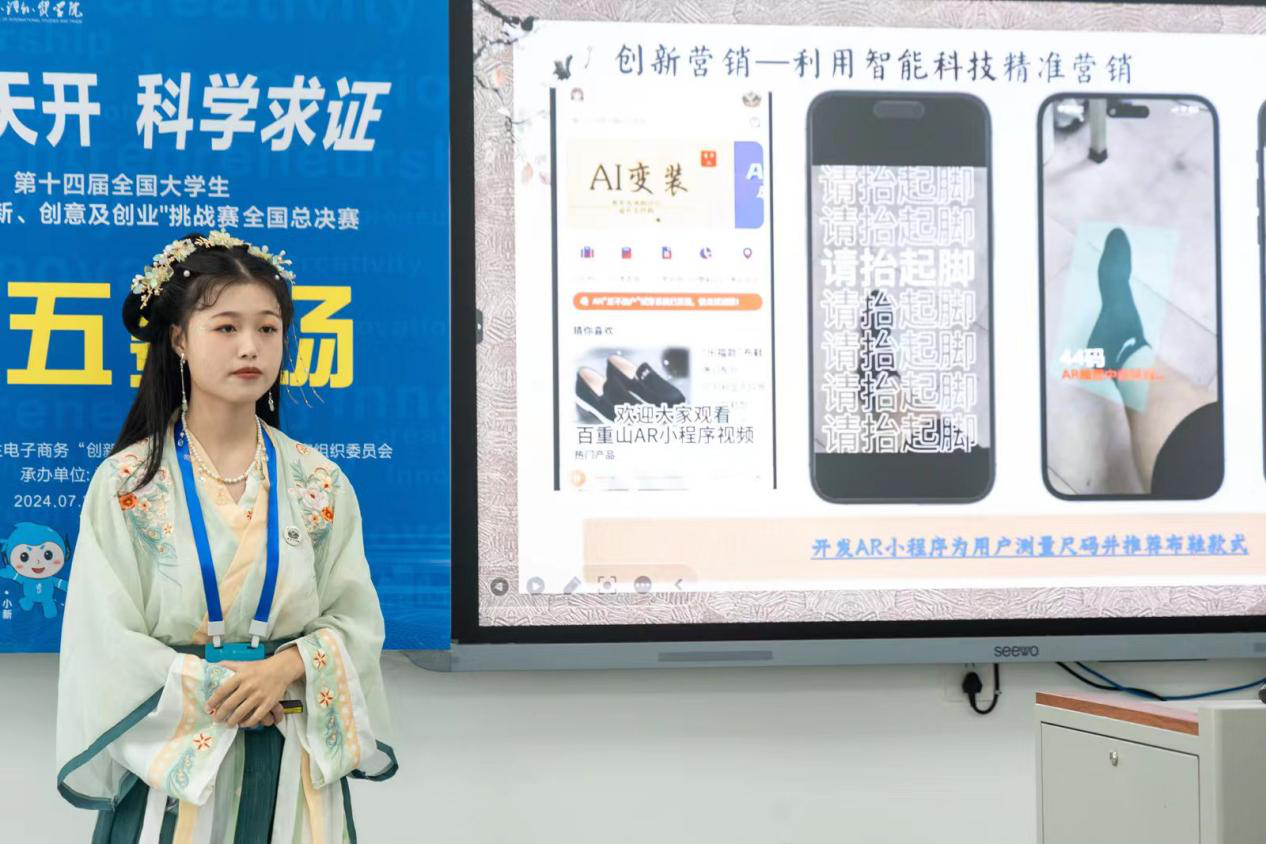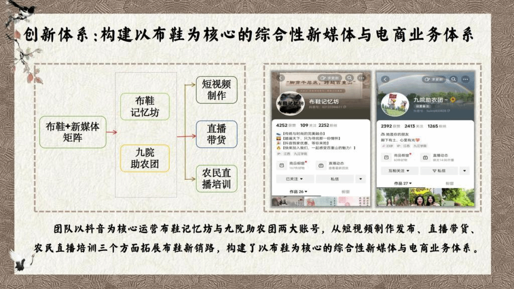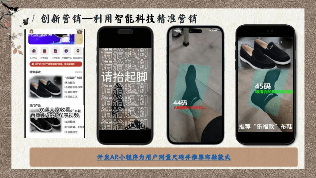永利yl23411集团官网代表队把消费者定位为深受注重悦己消费、民族认同感高的85后至00后,将布鞋与他们所喜爱的智能科技、国潮设计相结合,设计了“百重山”,一个集原创设计、直播培训、科技引流、新媒体营销、农民就业全覆盖的新型农业产业链逐步形成。为解决布鞋款式单一的难题,团队依托江西大江大湖、名山名人的特点,融入庐山,鄱阳湖,爱莲说等元素,设计出“浔阳凤冠”“匡庐青峰”“鄱湖烟雨”“爱莲君子”“青鹤湖山”等多款布鞋。同时,团队创新设计出“百重山智慧商城”“AR试鞋小程序”等吸引国潮爱好者的软件,利用智能科技实现了精准营销。