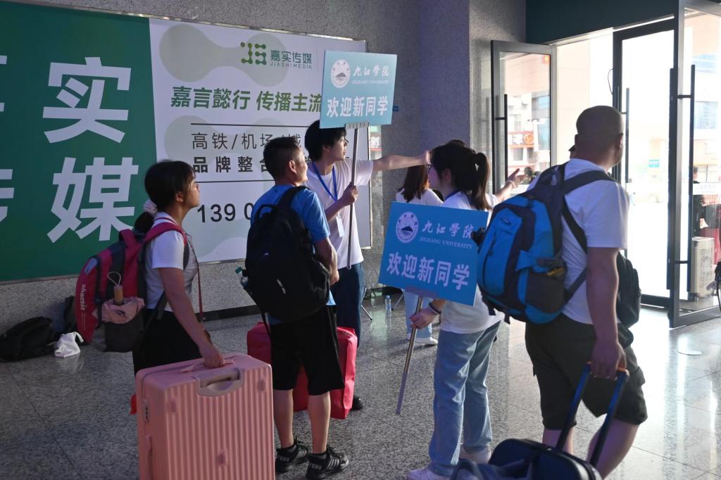 “九江学院的新同学来这边!学长学姐接你们去学校啦!”学校在九江站和庐山站分别设立迎新点,接站志愿者现场组织引导新生和家长有序乘坐迎新专车前往学校报到。在各个接站点,志愿者在指定的车站出站口举牌等候新生、协助新生及家长搬运行李,引导他们前往接待点进行信息登记。