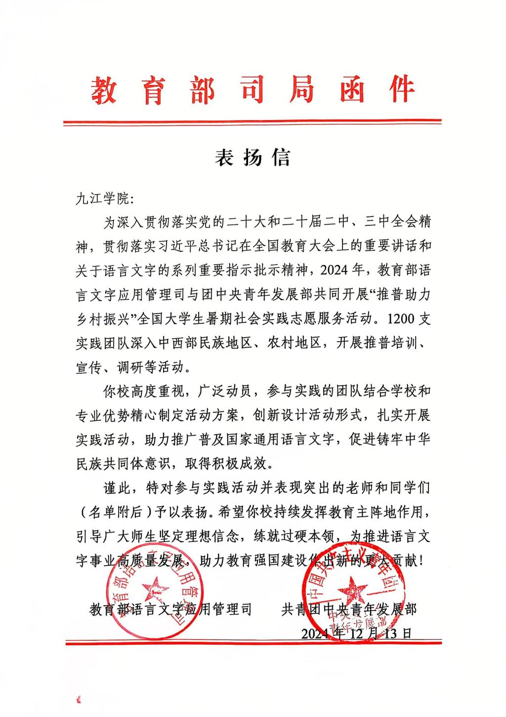 近日,教育部语言文字应用管理司与共青团中央青年发展部联合来函,表彰九江学院在2024年“推普助力乡村振兴”全国大学生暑期社会实践志愿服务活动中的突出表现。这一表彰充分肯定了九江学院扎实践行党的二十大精神,积极贯彻习近平总书记关于语言文字工作的重要指示批示精神和全国教育大会精神,利用国家语言文字推广基地助力乡村振兴的显著成效。