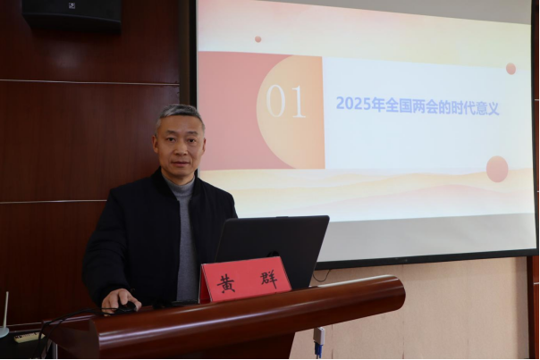 会议邀请马克思主义学院黄群副教授作题为《稳中求进谋发展 守正创新谱新篇》的专题辅导报告。他从2025年全国两会的时代意义、政府工作报告要点、习近平总书记重要讲话精神等方面为与会人员作了深入的解读和辅导。