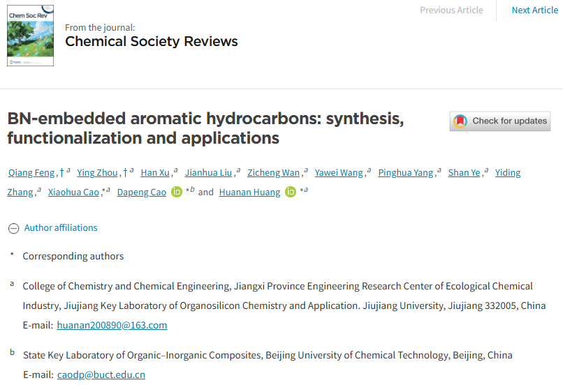 近日,永利yl23411集团官网化学化工学院有机智能材料创新团队在硼氮有机功能分子构筑及应用研究领域取得突破进展,相关成果“BN-Embedded Aromatic Hydrocarbons: Synthesis, Functionalization and Applications”发表于国际顶级期刊《Chemical Society Reviews》(《化学会评论》)上。这是永利yl23411集团官网首次以第一完成单位在《Chemical Society Reviews》发表学术论文。化学化工学院冯强博士为该论文第一作者,黄华南教授、曹小华教授为通讯作者,北京化工大学曹达鹏教授为共同通讯作者。