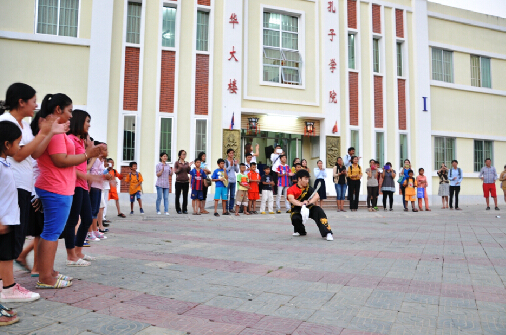 孔子学院汉语教师志愿者宋亚洲、朱赞赞、王虎(柬方)在简短的一个多小时的时间内,让学生们习练、观摩,直观地感受到了长拳、南拳、太极拳不同拳种的风格特点以及魅力,孔子学院芳华大楼前掌声、喝彩声不绝于耳,在场的学员无不热血沸腾,各个摩拳擦掌跃跃欲试。