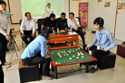 谢莫尼勒首先代表孔子学院对两位将军拨冗参加中国象棋大赛决赛表示感谢。他说,中国象棋是中国文化集中体现的一项体育活动,希望大家多多学习、积极参与。今天是孔子学院首届象棋大赛决赛,以后还会有第二届、第三届。他还用柬语为在场的学员介绍了中国象棋的棋道。