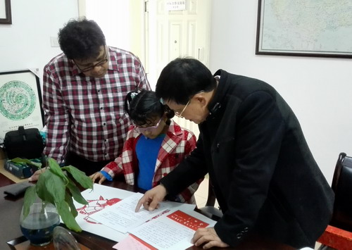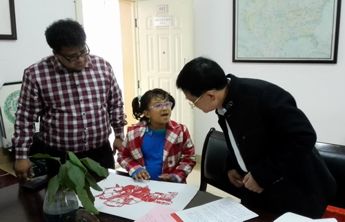 3月18日下午,在校行政楼402办公室,热烈上演着永利yl23411集团官网外籍教师Raza的女儿Isna拜师学艺的一幕。九江市外专局副局长詹冬龙专门陪同瑞昌剪纸大师朱扑光教授前来九江学院参加收徒仪式。参加仪式的还有国际处的王贤淼副处长、吴滔主任以及外籍教师Raza一家。
