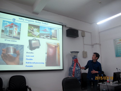 夏建龙教授首先向在座的老师们介绍了自己在研究生阶段和在美国留学期间的科研方向和科研成果,他的主要研究方向是聚合物自组装在有机半导材料领域的应用、单分子导电与金属有机分子导线、碳纳米管的导向合成等,并主要就太阳能电池的发展现状、技术特点、商业化前景等展开描述。
