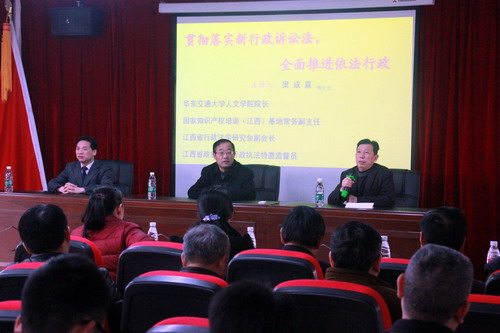 4月10日上午,九江市知识产权局在政法学院开展专利行政执法专题培训讲座,主讲教师为华东交通大学人文学院院长梁成意教授。九江市知识产权局胡雄彪局长主持并讲话,政法学院高翔书记向到场嘉宾致辞表示欢迎。宛锦春副院长、曹钟安助理等师生与九江市专利行政执法工作人员80余人一同聆听了讲座。