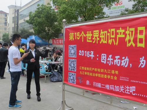为迎接第十五个“国际知识产权日”,进一步加强对知识产权司法保护的宣传,4月24日中午,政法学院联合市知识产权局在主校区三食堂广场前开展了以“法随我行、律动我心”为主题的世界知识产权日校园宣传活动,校团委书记闫来英、九江市知识产权局副局长刘晓英、政法学院院长助理曹钟安出席了此次活动,九江电视台法制频道对活动进行了现场采访报到。