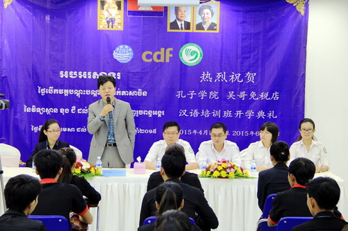 赵远昭说,近年来王家研究院孔子学院的各项工作卓有成效,在柬埔寨社会各界引起了强烈反响。此次,能与王家研究院孔子学院合作在CDF(暹粒省吴哥免税店)举办汉语学习班,机会难得,免税店全体柬埔寨籍销售人员的汉语水平必将得到大幅提高。对此,他谨代表暹粒省吴哥免税店对孔子学院的大力支持和帮助表示感谢。