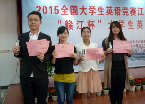 最终,外国语学院周健鑫同学获赣江杯大学生英语竞赛AB类口语特等奖、综合类一等奖。外国语学院彭雅玲同学获AB类综合二等奖、口语二等奖。旅游学院刘芳同学获赣江杯大学生英语竞赛D类口语特等奖、综合类一等奖。会计学院丁菊萍同学获D类综合类特等奖、口语一等奖。