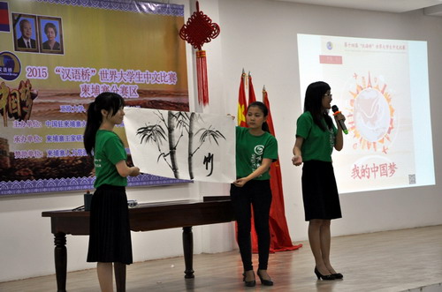 本届比赛以“我的中国梦”为主题, 共设置了汉语演讲和才艺表演两个环节。在演讲环节,选手们或回顾自己汉语学习的经历,或畅谈自己对中国文化感受最深的方面,博得了台下观众一阵阵热烈的掌声。在才艺展示环节,选手们的表演更是精彩纷呈。来自亚欧大学的王虎的武术包罗南拳、太极拳、太极扇,博得台下观众阵阵喝彩;江柏利的快板单口相声《十八愁》、赖业平的中文歌曲《母亲》,陈玉美的中国舞蹈《惊鸿舞》、陈文萍的中国画《竹》等各秀绝活,观众欢呼声不断。